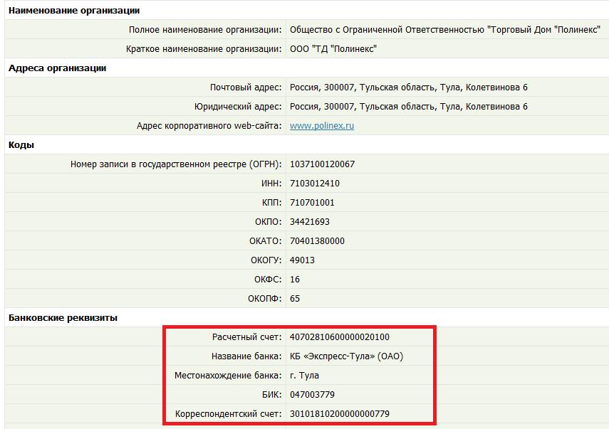 Вот, к примеру, старая карточка ООО «Торговый дом «Полинекс», где «Первый экспресс» фигурирует ещё под своим первоначальным названием «Экспресс-Тула».