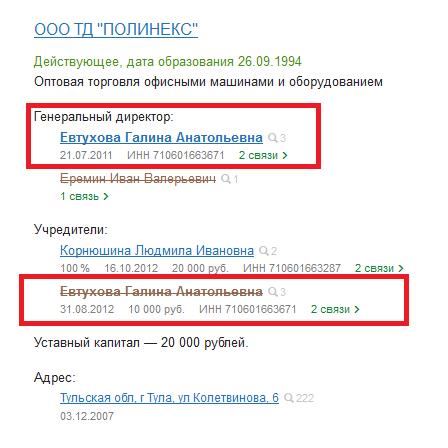 Напомним, что ООО «ТД «Полинекс» до того как был переведен на подставное лицо принадлежал жене Александра Евтухова Галине, которая до сих пор там директорствует.