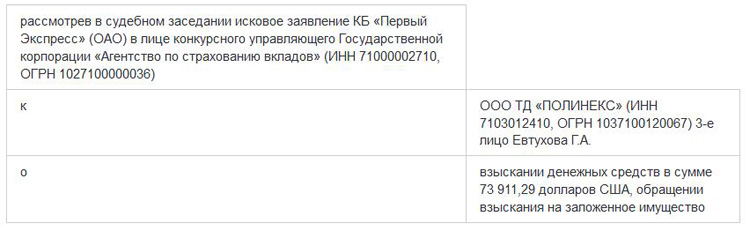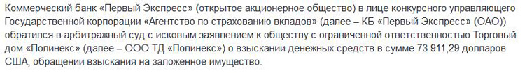 А это выдержка из определения Арбитражного суда Тульской области по делу № А68-10094/2014 от 19 декабря 2014 года, где «Полинекс» значится должником «Первого экспресса»: