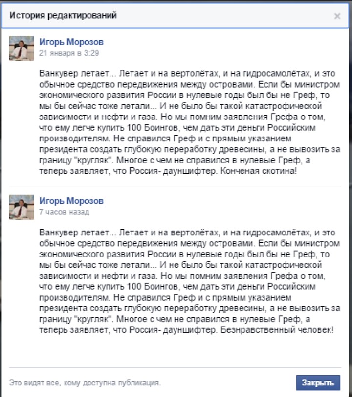Член комитета Совета Федерации по международным делам Игорь Морозов (на фото) в пятницу, 22 января, на своей странице в Facebook назвал главу Сбербанка Германа Грефа конченой скотиной.