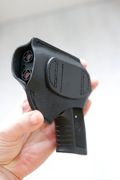 На обратной стороне на кобуре имеется пришитая пластина позволяющая зафиксировать его на ремне. В таком виде, думаю вид будет практически как у настоящего пистолета. Для многих простых гоповатых и подпитых типов этого уже будет достаточно.