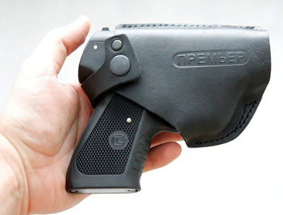 Кобура по всей видимости тоже фирменная с тисненным названием пистолета «Премьер» из натуральной кожи. Полностью закрывает спусковую скобу исключая случайных нажатий.