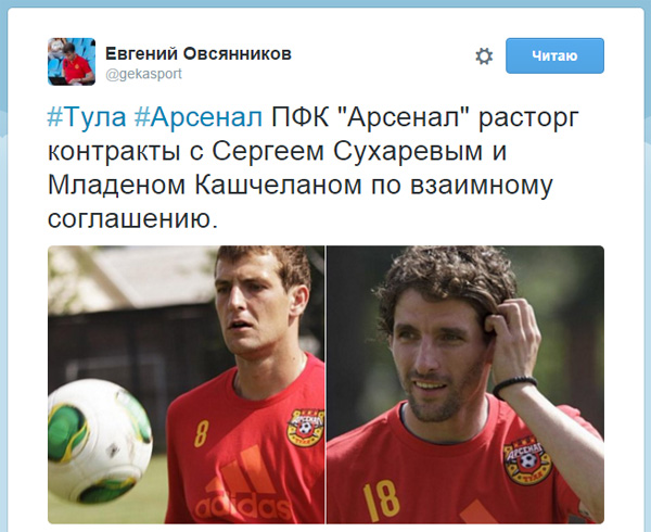 Тульский клуб вслед за Кутьиным и Тесаком покинули капитан команды Младен Кашчелан и Сергей Сухарев