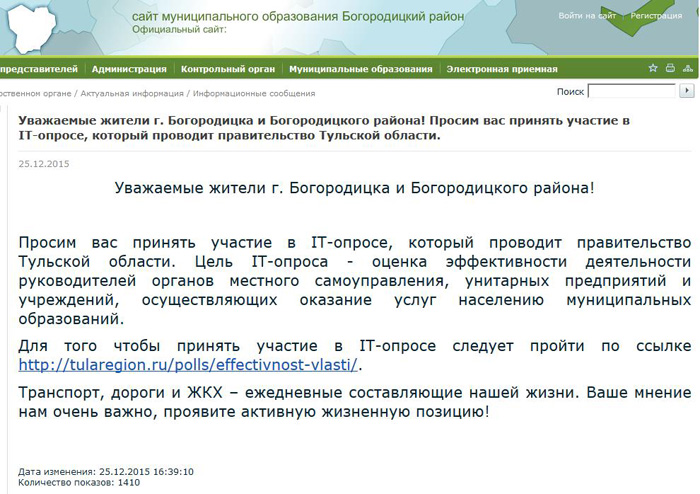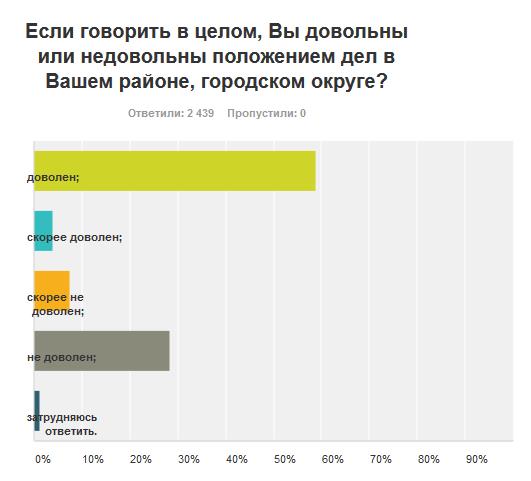 К примеру, 15 февраля на 17 часов по Москве в опросе населения Богородицкого района в графе количество ответов значилось 1.000 человек, а в первом вопросе, о положении дел в районе, в строке «доволен» была цифра 96 ответивших.