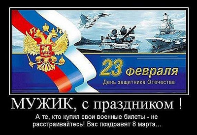 23 февраля к праздничному корыту отталкивая тех кто служил бегут и уклонисты-автомобилисты и онанисты и прочая шваль. На хрен всех. надо уже дать понять всем хитрожопым что не хочешь в армию- ни водительских прав ни права владения оружия ни права на госслужбу. Если ты мужик не только по тпричине причинного места-привыкай думать о последствиях хитрожопости.