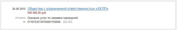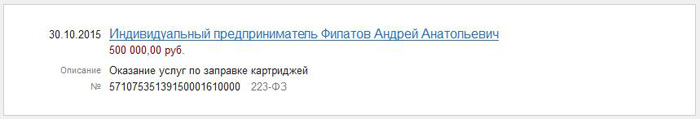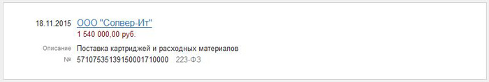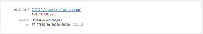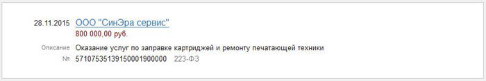Хотелось бы задать вопрос автору. А в чем разница между «победившими в «картриджных» тендерах» и «вот госконтракты по заправке картриджей», если вы пишете в «картриджных тендерах» — 24.08.2015 «Хелп» — «Оказание услуг по заправке картриджей», а потом в «госконтрактах по заправке» — 28.11 ООО «СинЭра» «Оказание услуг по заправке картриджей и…». И там и там контракты на площадке и там и там «заправка картриджей» , 21.10.2015 «Энвис» и СНОВА! «Оказание услуг по заправке картриджей». Т.е. как минимум три разные фирмочки трех разных людей картриджи заправляют. И на аукционах падения нехилые у них, бодаются между собой. Мне вот интересно, а в Тульской области вообще то фирм сколько, которые могут тысячами картриджи заправлять. И особенно интересно, зачем автор так разносим одинаковые закупки, отыгравшие на официальных сайтах с падениями на разные категории?