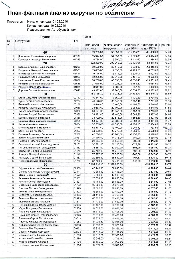 В графе «плановая выручка» указана минимальная сумма, которую водитель обязан привезти от продажи билетов. Водители разделены на группы – 60, 70, 80 и т. д. – эти цифры показывают, сколько процентов от заданной планом суммы привёз водитель.