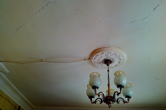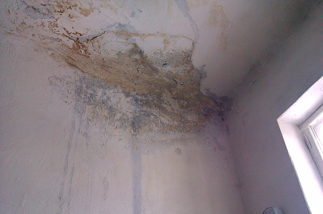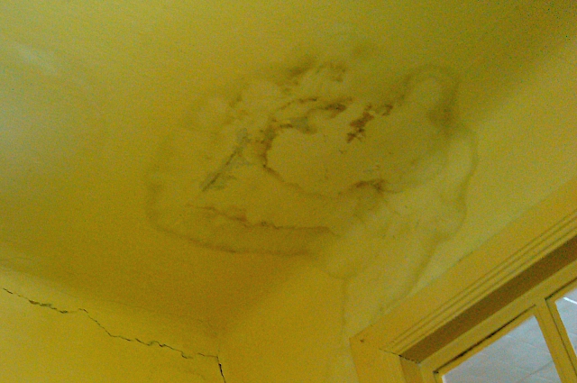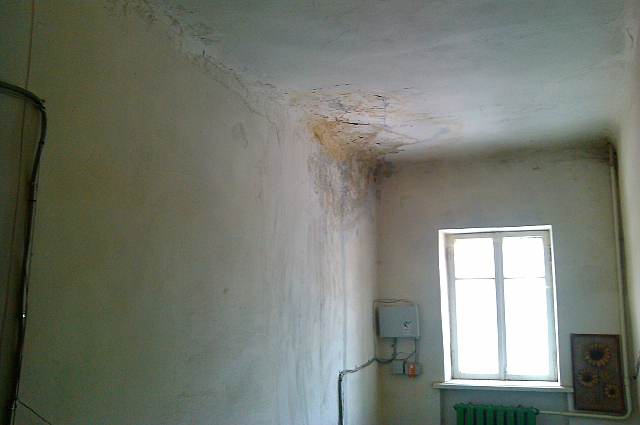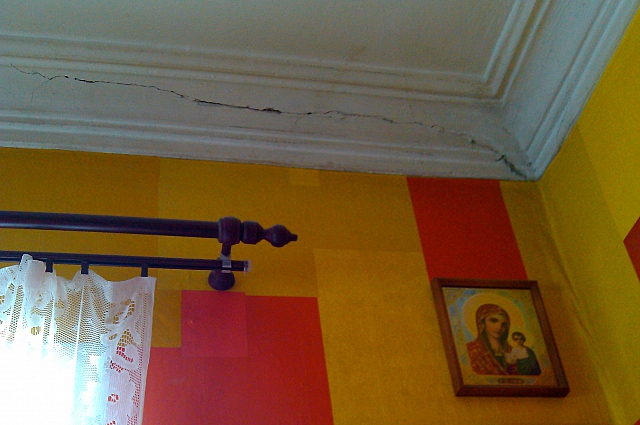 В дождь и оттепель у здешних жителей наступает весёлое время. Крыша обветшала настолько, что течёт и в подъезде, и в квартирах. Трещины красуются по всему потолку.