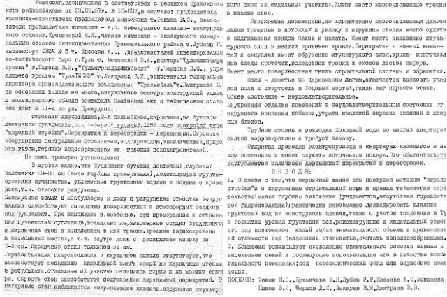 Сырость стен способствует подгниванию деревянных перекрытий. Имеют место многочисленные трещины в кладке стен. Перекрытия деревянные, по характерным многочисленным диагональным трещинам в потолках и уклону к наружным стенам можно судить о подгнивании концов балок и наката. Трубные стояки и разводка холодной воды во многих квартирах сильно коррозированы и требуют замены. Открытая проводка электропровода в квартирах находится в ветхом состоянии и может служить источником пожара. Это обстоятельство усугубляется наличием деревянных перекрытий и перегородок. Практически невозможно ликвидировать влияние грунтовых вод на конструкцию здания, … поэтому капитальный ремонт его под постоянное жильё считать нецелесообразным.