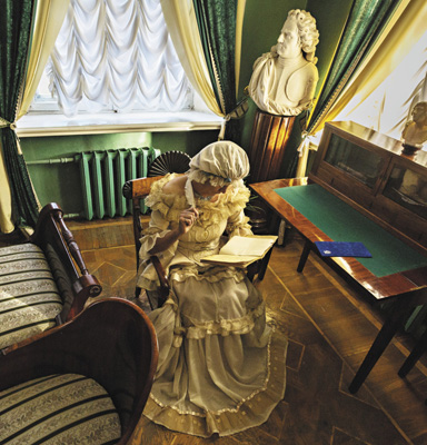 Перьевые ручки, приспособления для тушения свеч, набор для сжигания бумаги… Если бабушки еще помнят назначение этих предметов, то молодежи они непонятны. Многим уже скучно слушать академическую экскурсию, сухие подробности из жизни хозяев. Впрочем, вот вышедшие к нам девушки в нарядах екатерининских времен разыграли небольшую сценку. Экскурсии, проходящие в такой театрализованной форме, позволяют туристам погружаться в атмосферу и быт усадьбы. Жаль только, что в такой увлекательной форме экскурсии проводятся только по заказу.