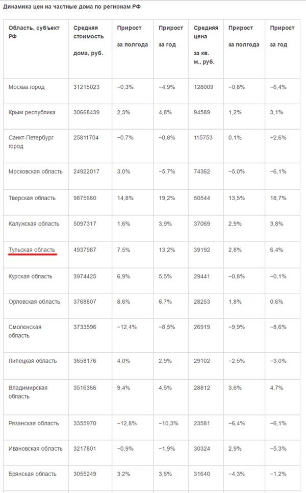 Тульская область — в середняках среди регионов России по стоимости частного жилья, согласно рейтингу, составленному федеральным порталом «Мир квартир».