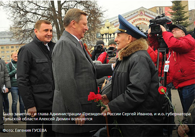 Было заметно — и глава Администрации Президента России Сергей Иванов, и и.о. губернатора Тульской области Алексей Дюмин волнуются. По крайней мере — когда прикрепляли к пальто георгиевские ленточки. И потом стояли перед ветеранами. А ветераны Великой Отечественной — их было не больше десятка- сидели в креслах напротив. Стоять им уже непросто. И держали в руках красные гвоздики. У некоторых были слезы.