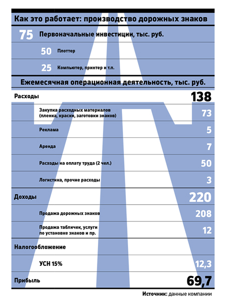 Дорожный знак из пленки типа А у Голубева стоит от 850 руб. (треугольной формы) до 1050 руб. (прямоугольной). «Средняя цена получается около 900 руб.», — говорит Голубев. За таблички и указатели он берет от 350 руб. В марте 2016 года было изготовлено 207 дорожных знаков, 56 знаков индивидуального проектирования (дорожные указатели и щиты) и 27 табличек для домов. Это принесло Голубеву около 220 тыс. руб. выручки. Около 70% этих денег приходится на себестоимость. Самая большая статья расходов — зарплата двух сотрудников (50 тыс. руб. в месяц) и закупка материалов (73 тыс. руб.). На аренду и маркетинг уходит 7 тыс. и 5 тыс. руб. в месяц соответственно. На налоги по УСН «доходы минус расходы» (15%) в месяц уходит около 12 тыс. руб. Прибыль составляет около 70 тыс. руб.