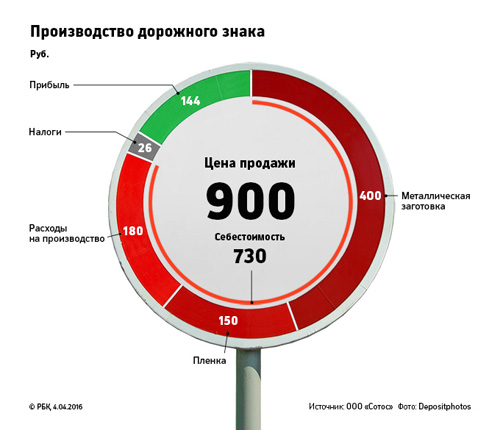 Антон Голубев зарабатывает на небольших частных заказах, которые малоинтересны крупным производителям. В Туле, по словам предпринимателя, ведущим поставщиком дорожных знаков является компания «ТрансСигнал». «Она участвует в электронных аукционах и поставляет продукцию государству, — рассказывает Голубев. — Мы же не можем позволить себе блокировать большие средства под обеспечение заявок и контрактов». Цены на дорожные знаки у «ТрансСигнала» и других крупных производителей ниже, чем у «Сотоса», не скрывает Голубев. Например, треугольный знак «Осторожно, дети» (I типоразмер, пленка А) у Голубева стоит 650 руб., а в московской компании «Оптима Сервис» он обойдется в 599 руб., в компании «Русдорбизнес» — в 610 руб. Изготовление и установка дорожных знаков — огромный рынок. Так, в сентябре 2015 года Центр организации дорожного движения Москвы провел конкурс на демонтаж старых и установку новых 23 724 дорожных знаков на сумму свыше 127 млн руб. Конкурсы на меньшие суммы регулярно проводят и региональные дорожные учреждения: на сайте госзакупок РБК удалось выявить почти 250 подобных закупок в 2014–2015 годах.