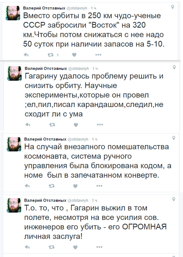 Зачем вы разместили здесь эту чушь? Разве Отставных работал на космодроме или был лучшим другом С. Королева и он ему рассказал, что во время запуска ракеты что-то пошло не так? Или про то, что Хрущев решил почему-то избавиться от Гагарина? Судя по по записям в твиттере, религоведу пить надо поменьше и гашиш не употреблять, тогда кошмаров, принимаемых за явь, не будет.