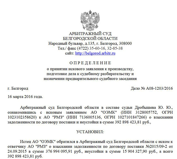 По имеющейся у нас информации, АО «РМЗ» задолжал АО «Оскольский электрометаллургический комбинат» сумму в размере 376.994.095 руб. 91 коп, и данное исковое заявление уже принято к производству Арбитражным судом Белгородской области.rev-04-as