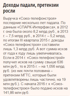 «Союз-телефонстрой» – бывшая головная компания группы «Инфра инжиниринг», объединившей в 2010 г. строительные активы в отрасли связи. Бывший гендиректор холдинга «Связьинвест» Евгений Юрченко связывал эту группу с фондом «Маршал капитал» Константина Малофеева (ему принадлежало 10,7% обыкновенных акций «Ростелекома»). Малофеев это всегда отрицал. Пока президентом «Ростелекома» был бывший сотрудник «Маршала» Александр Провоторов, «Инфра» была одним из крупнейших подрядчиков межрегиональных компаний связи, впоследствии вошедших в «Ростелеком». По данным проверки Счетной палаты, в 2010 – начале 2011 г. на «Инфру» приходилось 25% подрядов компаний «Связьинвеста» – около 9 млрд руб., а в заказах на строительно-монтажные работы ее доля составляла 80%. В это время «Ростелеком» обеспечивал более 50% выручки «Инфры», гласили выводы Счетной палаты.