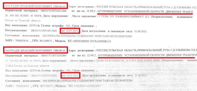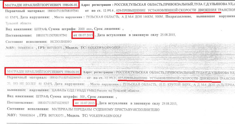 8, 10, 14 и 15 июля того же 2015 года Маградзе опять превышает скорость, нарушая правила дорожного движения: