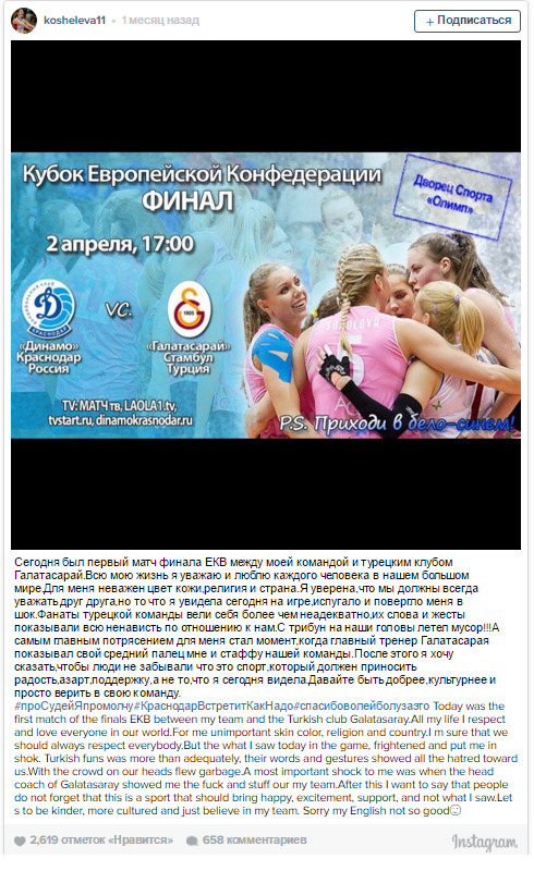 Высокое место ей обеспечило сообщение в «Инстаграме» о том, что во время матча Кубка Европейской конфедерации волейбола в Стамбуле краснодарское «Динамо», за которое она выступает, подвергалось оскорблениям болельщиков. В частности, в российских волейболисток бросали мусор, а тренер «Галатасарая», с которым они играли, показывал средний палец тренерам «Динамо».