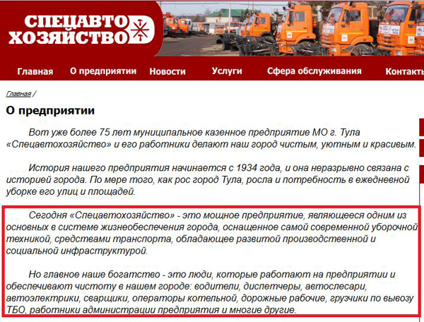 Ведь АО «Спецавтохозяйство», согласно его собственному сайту, это мощное предприятие, являющееся одним из основных в системе жизнеобеспечения города, оснащенное самой современной уборочной техникой, средствами транспорта, обладающее развитой производственной и социальной инфраструктурой.