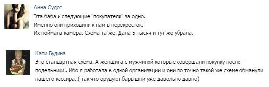 На видео, действительно, вся схема как на ладони. На кассе слева женщина, расплачиваясь за покупки, потягивает кассиру крупную купюру. Но не отдает ее в руки сотруднице супермаркета, а начинает искать мелочь, чтобы «округлить» сдачу. «Роняет» мелочь, и когда нагибается, чтобы собрать монетки, складывает крупную купюру и прячет обратно в кошелек. Собрав мелочь, отдает ее кассиру и ждет сдачи — якобы, она уже отдала девушке крупную купюру. Девушка немного колеблется, но затем все же выдает необходимую сумму. Видимо, действительно подумала, что забрала купюру у покупательницы: