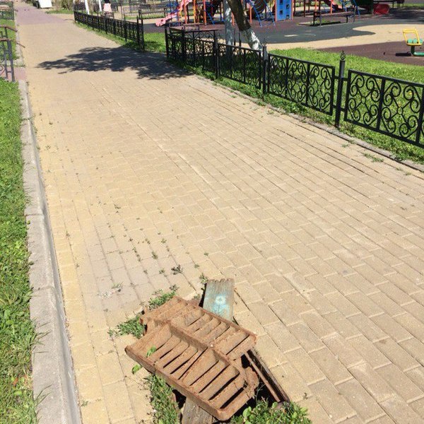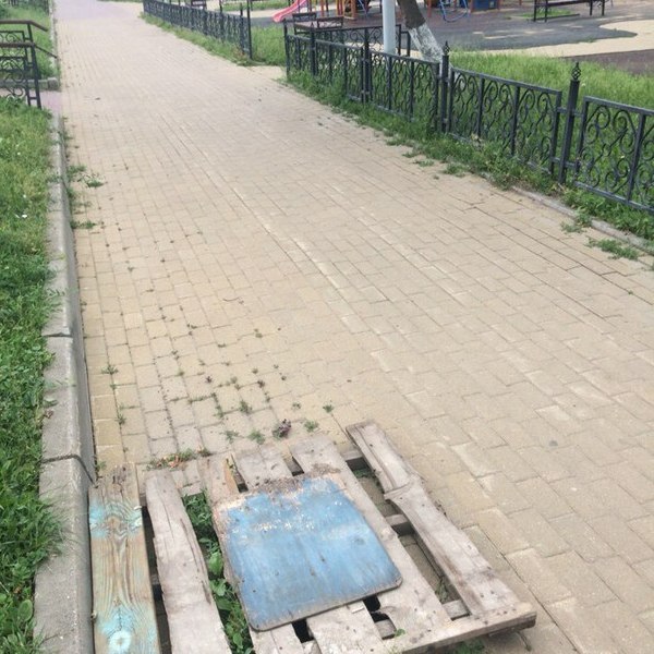 Ну и конечно очень хотелось бы поговорить про ХИТ сезона! Это раздолбанная ливнёвка у детской площадки в сквере Афганцев. 14 июня мы её случайно увидели и закрыли как смогли доской, чтобы туда не упал никто.skver_proval