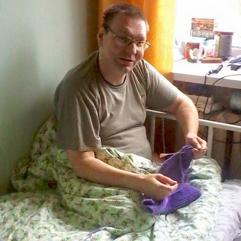 И вот увлекся вязанием 🙂 А также посещает спортивный зал, читает, играет в лото с соседями — всей комнатой.