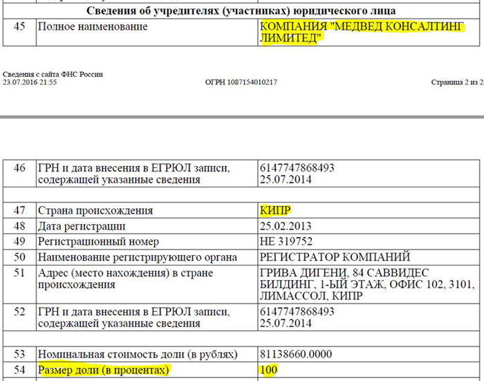 Итак, согласно ЕГРЮЛ единственным участником ООО «Торговый дом «Медведь» является кипрская компания «МЕДВЕД КОНСАЛТИНГ ЛИМИТЕД» (юр. адрес: ГРИВА ДИГЕНИ, 84 САВВИДЕС БИЛДИНГ, 1-ЫЙ ЭТАЖ, ОФИС 102, 3101, ЛИМАССОЛ, КИПР).medved