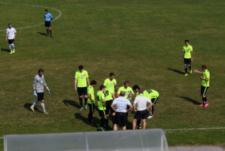 Минута идет за минутой, а воплотить игровое преимущество в голы у алексинцев не выходит — крепко обороняется соперник, а все фланговые навесы улетают за лицевую линию. «Забей, б****!« — слышится от тренера „Алексина“ Константина Чейкина после очередной загубленной атаки. Судья даёт свисток и направляет команды на водопой: игроки жадно хватают пятилитровые бутылки, пьют, обливаются. Пользуясь моментом, тренеры пытаются что-то объяснить футболистам. Наставник алексинцев Чейкин, накрыв от жары голову игровой футболкой, призывает быть активнее в атаке.fut-03