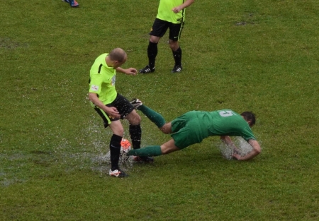 Но главной грозой всех полей был и остается ливень. После сильного дождя поля покрываются лужами, а мяч по воде катится на метр-два, футбол превращается в водное поло. Был даже случай, когда игрок выходил один на один, прокинул мяч мимо вратаря, побежал радоваться к трибунам, но снаряд застрял в луже во вратарской. А непременный спутник луж — это грязь.