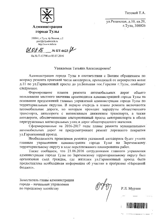 обратите внимание на левы нижний угол в письме г-на Мурзина есть фамилия Титов. Вот от этого чиновника зависит ремонт дороги а не от губернатора.