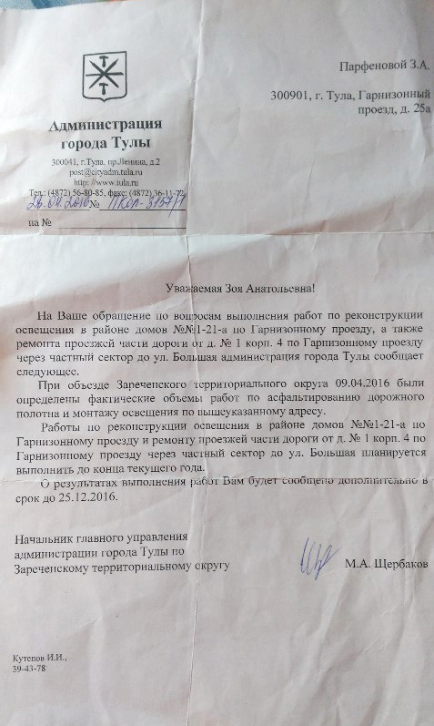 И вот наконец-то в начале года после личного приёма у Авилова, который глядя в глаза нашим бабулям обещал дорогу, было получено письмо (см. фото ниже) в котором жителям обещали работы выполнить до конца года. Лето подходит к концу, работ по дороге нет, вместо этого провели собрание по народному бюджету. И вот сюрприз на наши обеспокоенные письма, когда же ремонт, приходит ответ что в планах на 16 и 17 год, ремонт дороги не значится. И разъяснения, где в первую очередь ремонты город проводит.