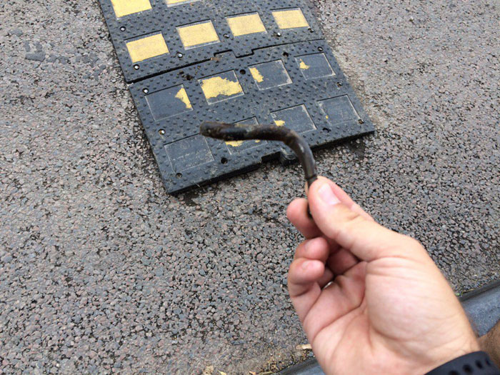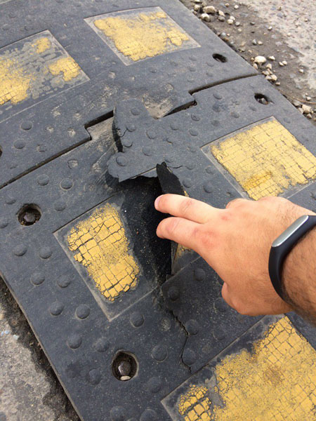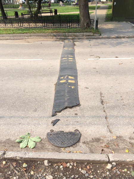 Результаты удручающие, все прекрасно видно на фото, помимо отсутствия некоторых блоков, много ИДН с вылезающими анкерными болтами, о которые легко повредить колесо автомобиля. И что самое печальное, помните тот самый лежачий полицейский у 11 гимназии, установки которого мы так долго добивались? Он тоже в аварийном состоянии…