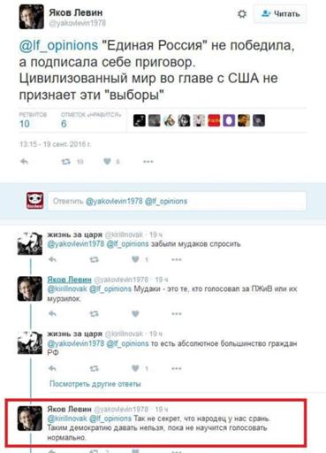 Эти же адепты, вроде некоего Якова Левина в Твиттере после запели про то, что «народец у нас срань. Таким демократию давать нельзя, пока не научатся голосовать нормально».vyb-01-levin