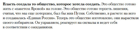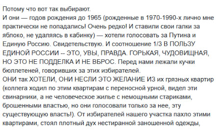 Но мы ограничимся только одним замечанием, которое циркулирует сейчас по сети: «и эти люди, с такими оценками российского общества почему-то удивляются, что общество за них не проголосовало. Удивительно, правда?».