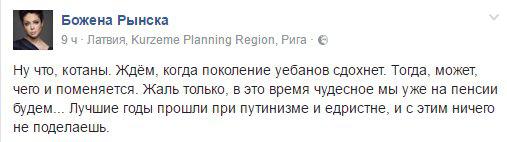 Иные были куда откровеннее. Известная либеральная активистка Божена Рынска как всегда не стеснялась в выражениях, а точнее в площадном, хабалистом мате, характеризуя народ, и желая ему «поскорее сдохнуть».vyb-04-kuricyna