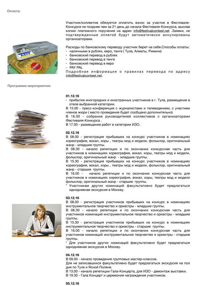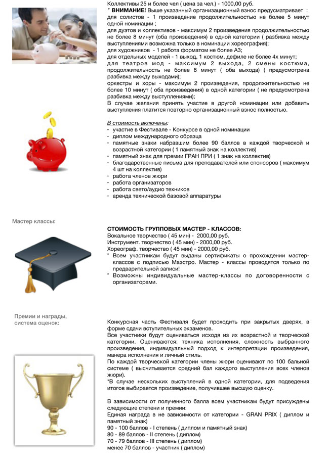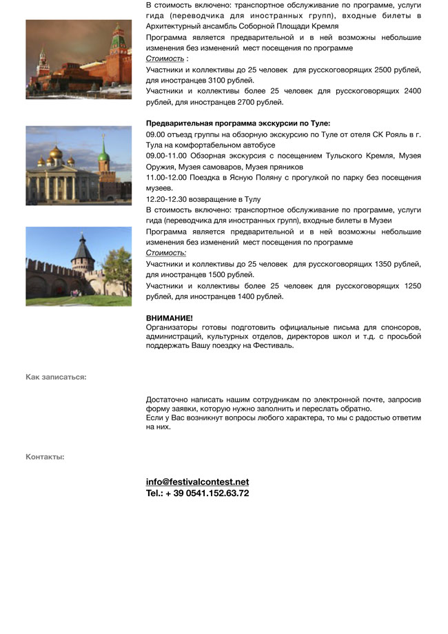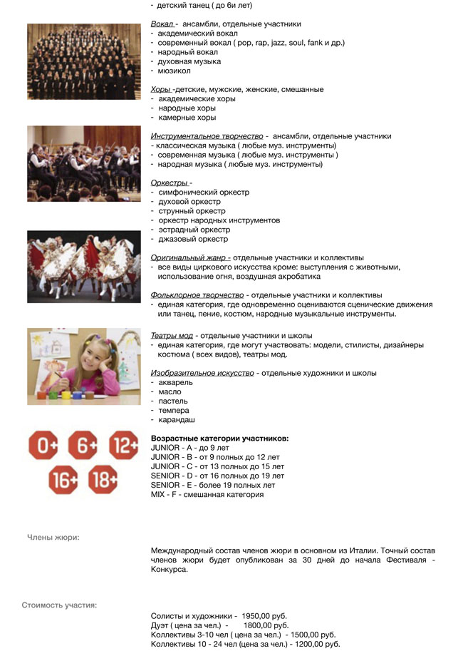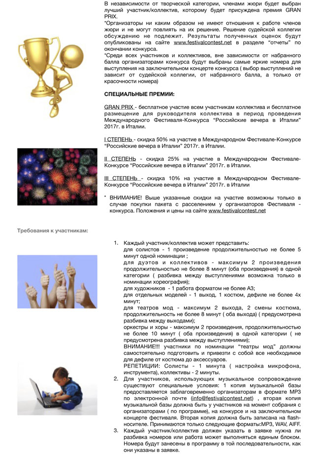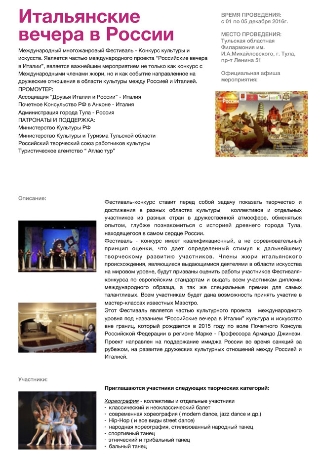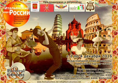 Как сообщает, «Festival & Contest», международный многожанровый Фестиваль — Конкурс культуры и искусств. Является частью международного проекта “Российские вечера в Италии”, является важнейшим мероприятием не только как конкурс с Международными членами жюри, но и как событие направленное на дружеские отношения в области культуры между Россией и Италией.