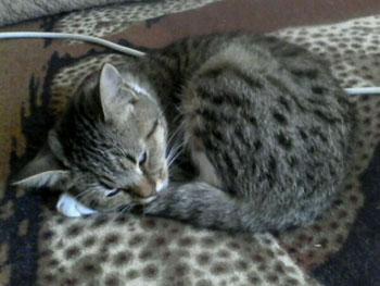 Около 10.30 подъехала вышка. Добрый работник ЖЭУ спас малыша и передал его мне. Котёнок не сопротивлялся даже. Так измучился!kot2Принесла домой, отогрела, накормила, чуть тарелку Кузину не съел! Потом начал умываться, поурчал на Кузю, успокоился. С характером котёнок!