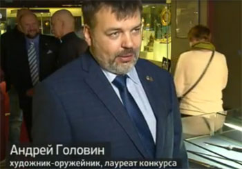 «Я не придерживаюсь ни проб, ничего. Сплавы сам делаю всевозможные, сам их выдумываю и сам их потом применяю. Этот нож называется Архангел. Архангел Михаил. У Архангела должны все-таки крылышки быть белые. Серебро имеет белый цвет. Любое серебро со временем темнеет, надо сделать так, чтобы оно не потемнело. Я это сделал», — показывает свою работу Андрей Головин, художник-оружейник, лауреат конкурса.