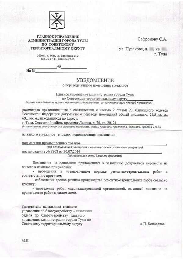 Но в этом уведомлении ни слова не говорится о разрешении вынести помещение, предназначенное под магазин для торговли промышленными товарами, за пределы МКД. Значит должно быть еще одно разрешение и вряд ли его подписал Коновалов. Не те у него функции в администрации Тулы.