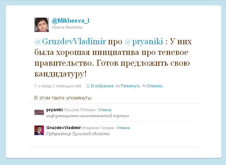 Владимир Груздев готов войти в теневое правительство "Тульских PRяников"