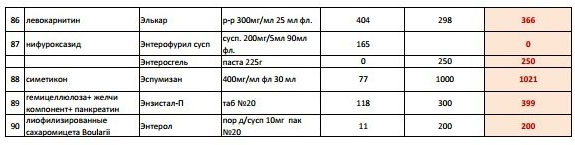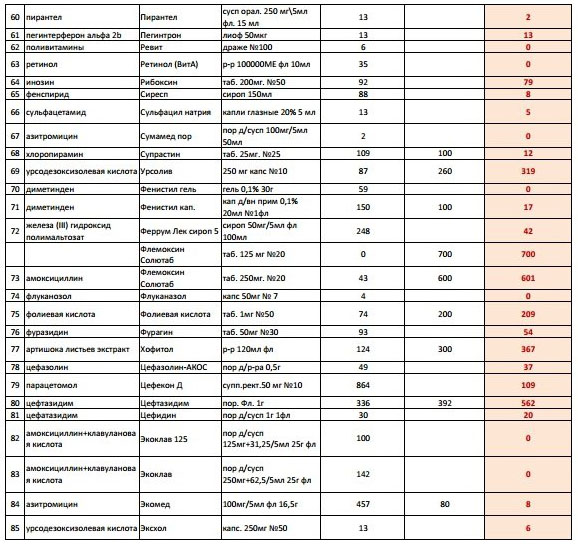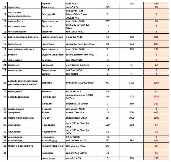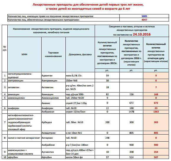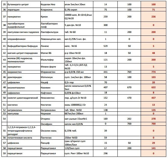 В-четвёртых, что, возможно, самое ГЛАВНОЕ, – ПРОБЛЕМА НЕХВАТКИ И ДАЖЕ ПРЯМО ОТСУСТВИЯ ЛЕКАРСТВ ФАКТИЧЕСКИ ПУБЛИЧНО ПРИЗНАЁТСЯ! Если раньше нам пудрили мозги, что всех лекарств хватает, что все права соблюдаются, то теперь мы открываем список и ясно видим, что по состоянию на 24 октября нет, например, Бисептола, Парацетамола в свечах, Пантогама, Ретинола, Экоклава и т.д., почти нет (осталось несколько штук) Витрума, Мезима Форте, Нафтизина, Супрастина и т.д. С такой информацией можно обращаться в компетентные органы. В тоже время, если с лекарствами, которых вообще не осталось — всё более или менее понятно, то с лекарствами, которых из списка в список переходит по паре штук — сложнее. Мезим Форте в списке от 7 октября указан в количестве 5 штук, 24 октября в таком же количестве. Неужели за это время никому его не прописывали? Аналогичная ситуация с Нафтизином: в обоих списках значится 8 штук. Тут, конечно, вопрос остаётся, и родители, которым отказывают в выписке рецепта на препарат, указанный в списке (пусть и в малых количествах), должны добиваться официального отказа по причине ОТСУТСТВИЯ. Тогда-то будет ясно, существуют ли реально на складе эти единичные лекарства, припасены ли они для «своих». В общем, тут нужно «додавливать», чтобы эти остатки были либо реально розданы, либо указано их отсутствие по итогам инвентаризации.