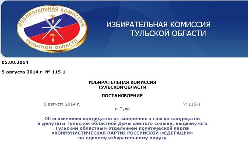 - Исключить из заверенного списка кандидатов в депутаты Тульской областной Думы шестого созыва, выдвинутого Тульским областным отделением политической партии «КОММУНИСТИЧЕСКАЯ ПАРТИЯРОССИЙСКОЙ ФЕДЕРАЦИИ» по единому избирательному округу,9 кандидатов в связи с сокрытием сведений о судимости (подпункт «б» пункта 26 статьи 38 Федерального закона от 12 июня 2002 года № 67-ФЗ «Об основных гарантиях избирательных прав и права на участие в референдуме граждан Российской Федерации»):