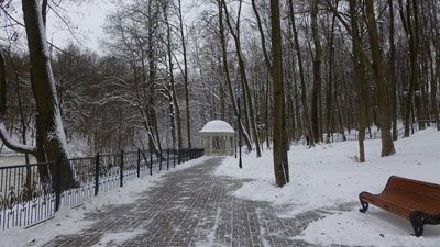 P1040221Сейчас здесь белое безмолвие, в центре площадки фонтан, закрытый на зиму, а за ним колоннада в классическом стиле.