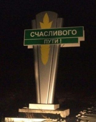 На одной стороне дороги — название района и надпись «Добро пожаловать», на другой — пожелание «Счасливого пути», написанное с грамматической ошибкой.