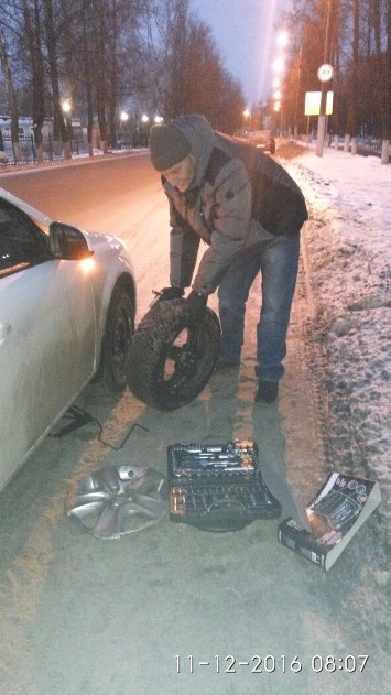 Итак начну с самого начала. Сегодня 11.12.2016 г. в 6.50 пошёл греть машину в связи с поездкой в Калугу к рукастым одноклубникам (пересвет , кнопка спорт, установка ПТФ). Вроде завелась с полоборота прогрелась (как обычно). В 7.00. вышла жена. Тронулись. Чувствую что-то не так. Сначала грешил на снежок на дороге. Машина ведёт себя как то неровно. Вышел на круг на ДК Комбайностроителей по привычке подтопил . Машину водит ппц. Тормознул. Думал тросик ручника клинит. Жена вышла посмотреть как крутятся колёса и смотрю машет — мол выходи, приехали, конечная. Выхожу смотрю переднее колесо со стороны пассажира на ободе. Твою мать. Звоню в Калугу Ивану. Так мол и так подзадержусь. Начал качать дабы до шиномонтажки доковылять. Ближайшая круглосуточная в начале Рязанки км 5.Насос качает минут десять толку никакого. Начиню более тщательно осматривать колесо.Мать моя женщина — боковой порез 3-4 см. Всё ясно. Запаска. Танцы с бубном с родным опелевским домкратом (кто знает тот поймёт). Запаска стоит.avto-01