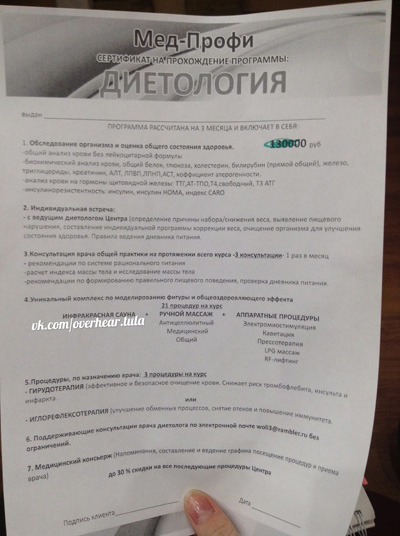 После обработки вас убеждают купить программу за 70000-130000 рублей, куда входят сомнительные массажи и сомнительные консультации сомнительных специалистов. Если денег нет, у них есть кредитный агент. Главное — уговорить «больного» на спонтанную покупку.