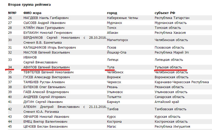 В Национальном Рейтинге Мэров Евгению Авилову отвели непривычно скромную по последним временам строчку