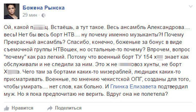 В причинах катастрофы будут разбираться специалисты. Пока что все в шоке, как это обычно бывает в таких случаях. И не потому что погибли артисты, а потому, что нет больше людей, у которых остались жёны, мужья, дети, родители. Потому что погибли совсем молодые ребята-журналисты.
