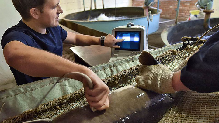 Из бассейна работники вытаскивают крупную самку. Кладут на брезент. Сын Шебанина Дмитрий водит по ее мокрому брюху датчиком аппарата УЗИ. Что на дисплее? Есть икра! Следом — биопсия. Особым щупом из рыбы достается несколько икринок, чтобы обследовать их и понять, готова ли она «рожать» прямо сейчас.